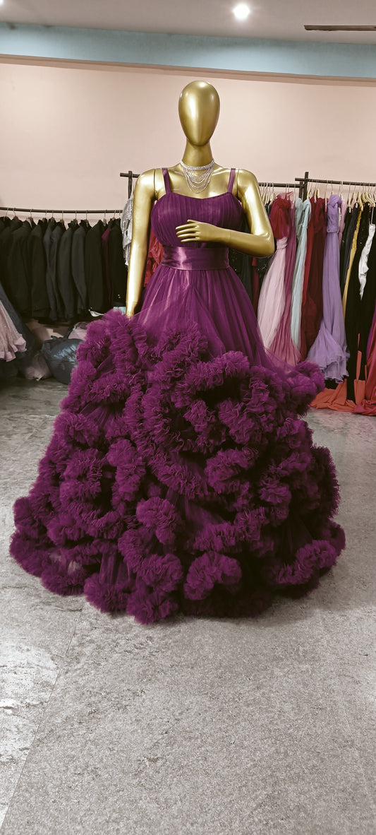 G406, Dark Purple Ruffled Frill Prewedding Shoot Trail Gown, Size (All)pp